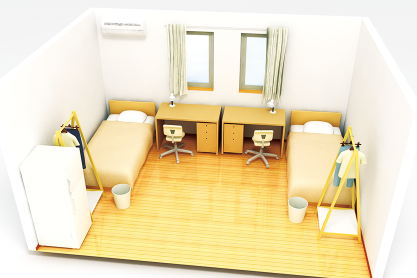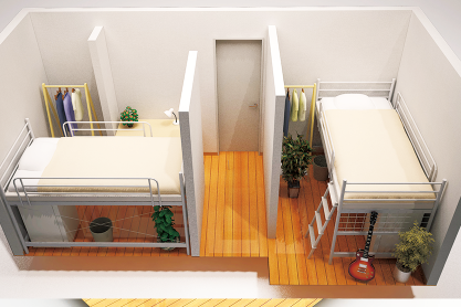 2人でシェアするタイプのお部屋。シングルルームよりリーズナブルで、ドミトリーに比べて、より多くの収納や個人スペースがある。