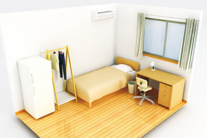 プライベートタイプのお部屋。冷蔵庫。エアコン。ベッド(布団)完備。プライベートな空間を確保したい方・荷物が多い方向き。