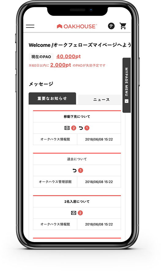 マイページを利用すると、入居に関する各種お手続きの他に、スタッフとのメッセージの送受信など便利な機能をたくさんご用意しています。